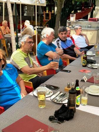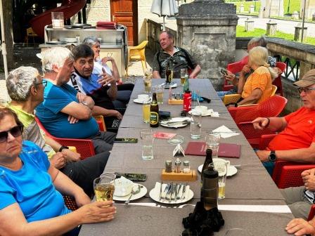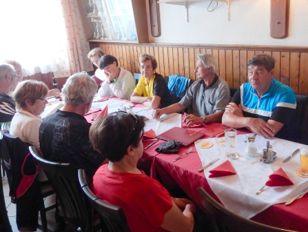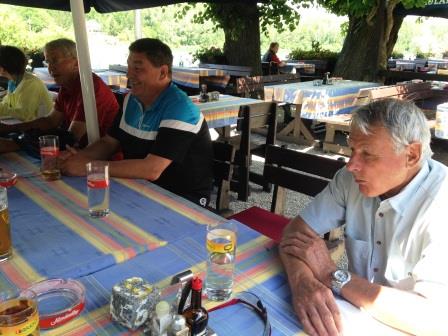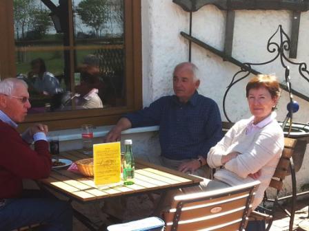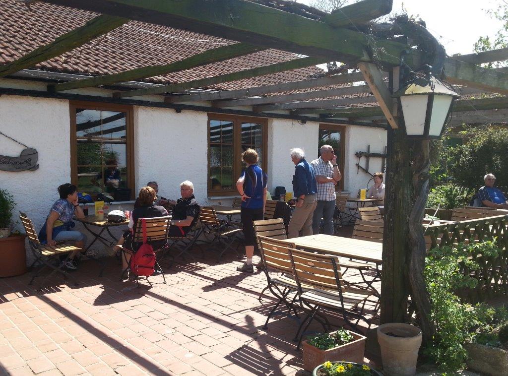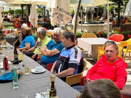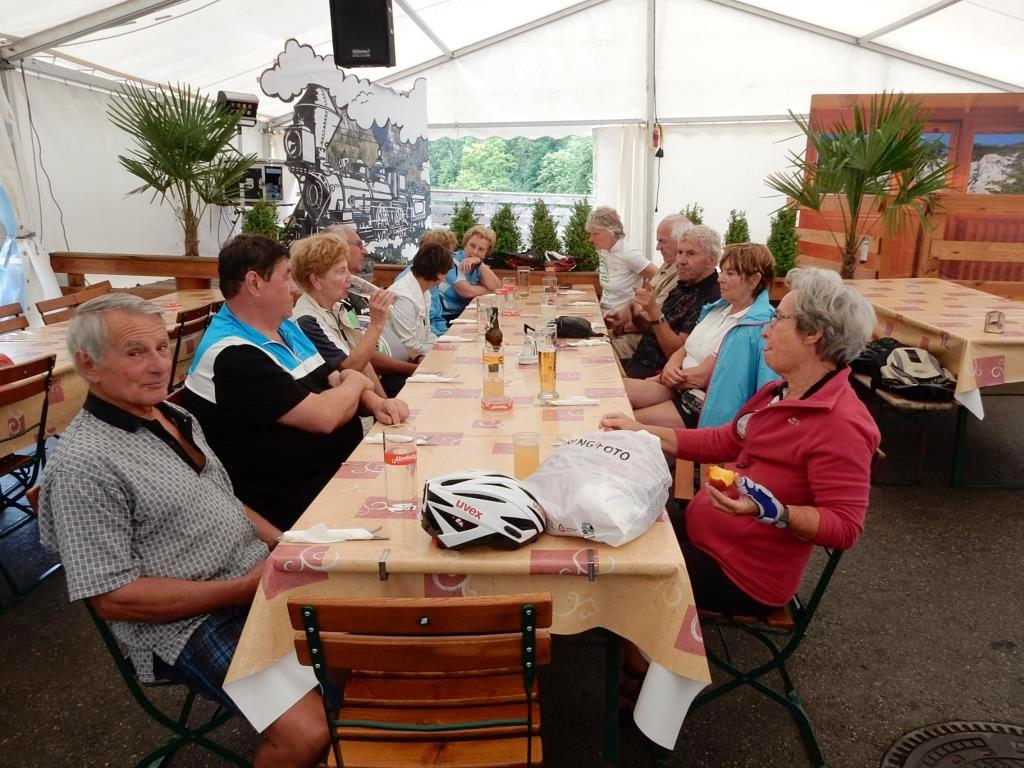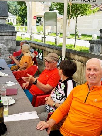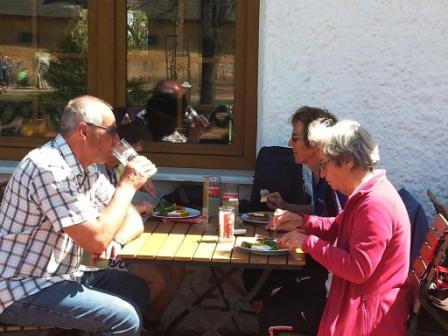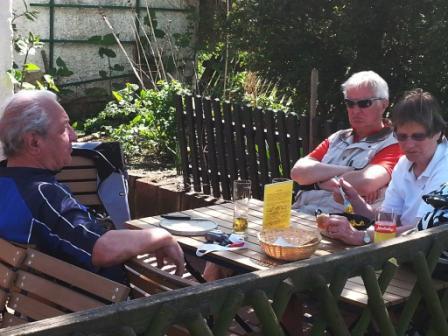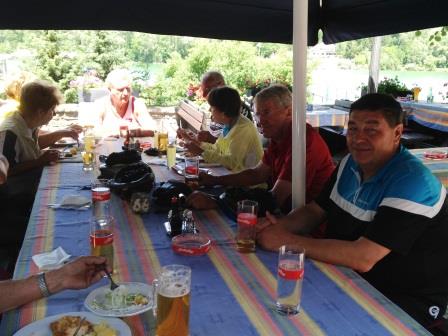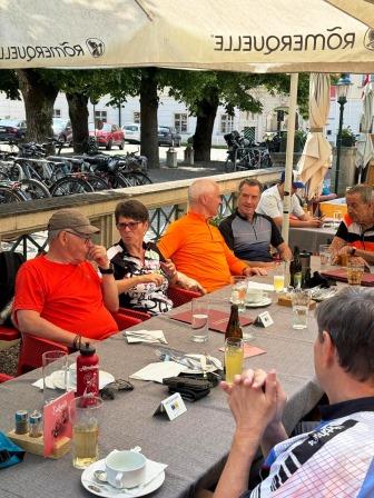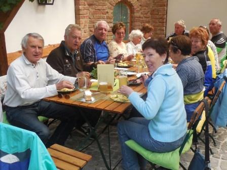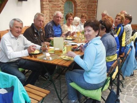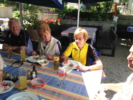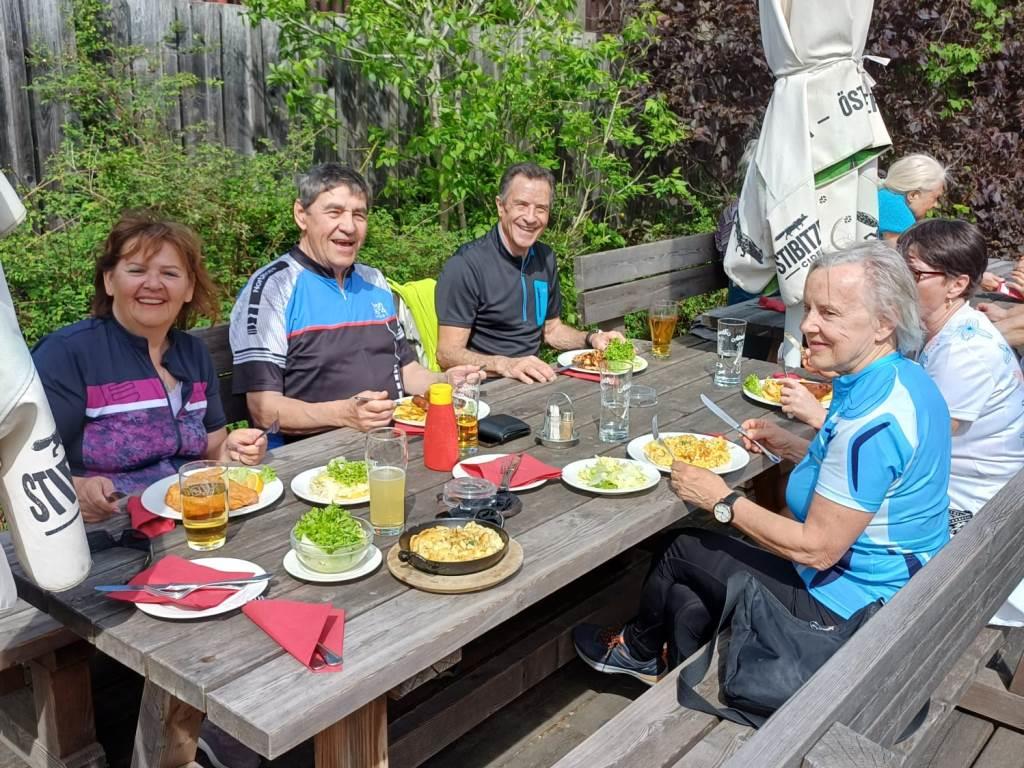 Die 6 unerschütterlichen (das Wetter war leider mit Regen verbunden) Radler sitzen gemütlich in Moosbrunnn zu Mittag.