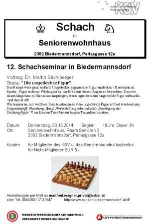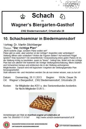 6. Schachseminar in BiedermannsdorfDas Schachseminar am 17.11.2011 war ein voller Erfolg. Es waren 18 Schachinteressierte dabei, soviele wie noch nie. Die wichtigste Erkenntnis aus dem Vortrag von Dr. Martin Stichlberger ist "Alle Figuren sollen mitspielen!" Beschreibung des Themas: Power-Schach!