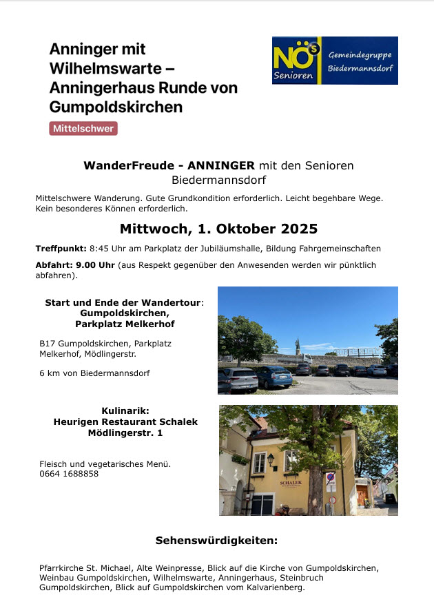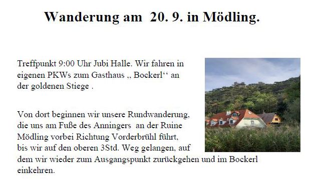 | 01. | Oktober | Wanderung Gumpoldskirchen- Anninger-Wilhelmswarte | 10 km -3,17 h |