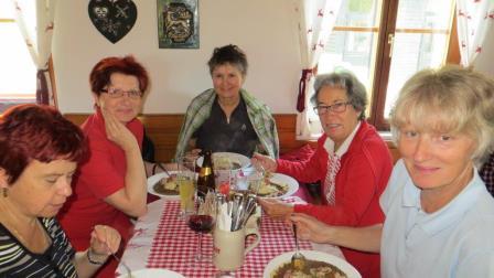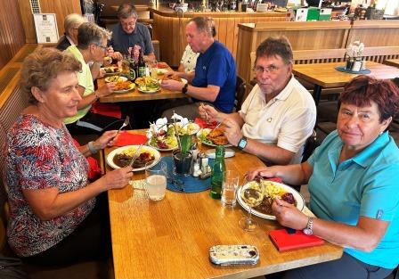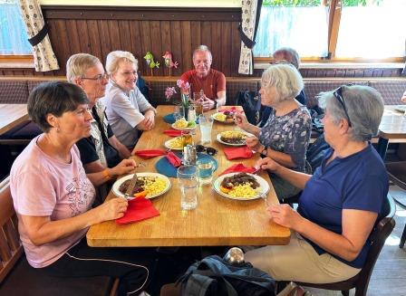 24 Wanderer lassen sich das Mittagessen im Klostergasthof Thallern gut schmecken