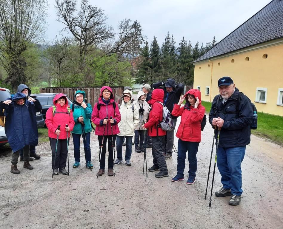 28 Senioren starten diese Wanderung von der Arbachmühle über die Mannersdorfer Wüste zur Ruine Scharfeneck