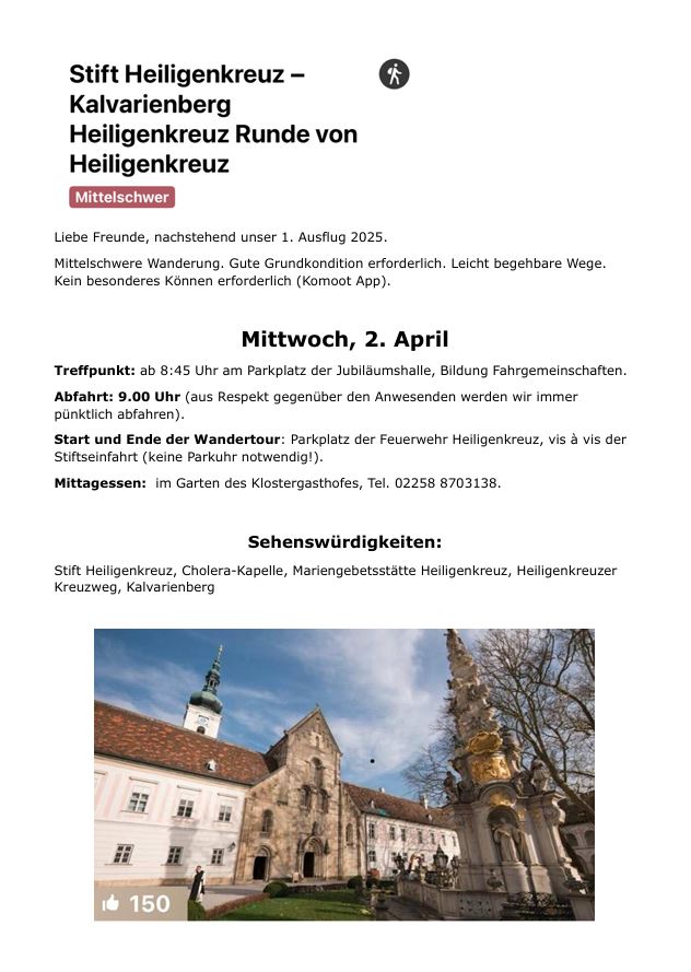 | 02. | April | Rundgang Stift Heiligenkreuz - Kalvarienberg-Kreuzweg | 8,2 km -2,15 h |