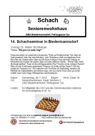 6. Schachseminar in BiedermannsdorfDas Schachseminar am 17.11.2011 war ein voller Erfolg. Es waren 18 Schachinteressierte dabei, soviele wie noch nie. Die wichtigste Erkenntnis aus dem Vortrag von Dr. Martin Stichlberger ist "Alle Figuren sollen mitspielen!" Beschreibung des Themas: Power-Schach!
